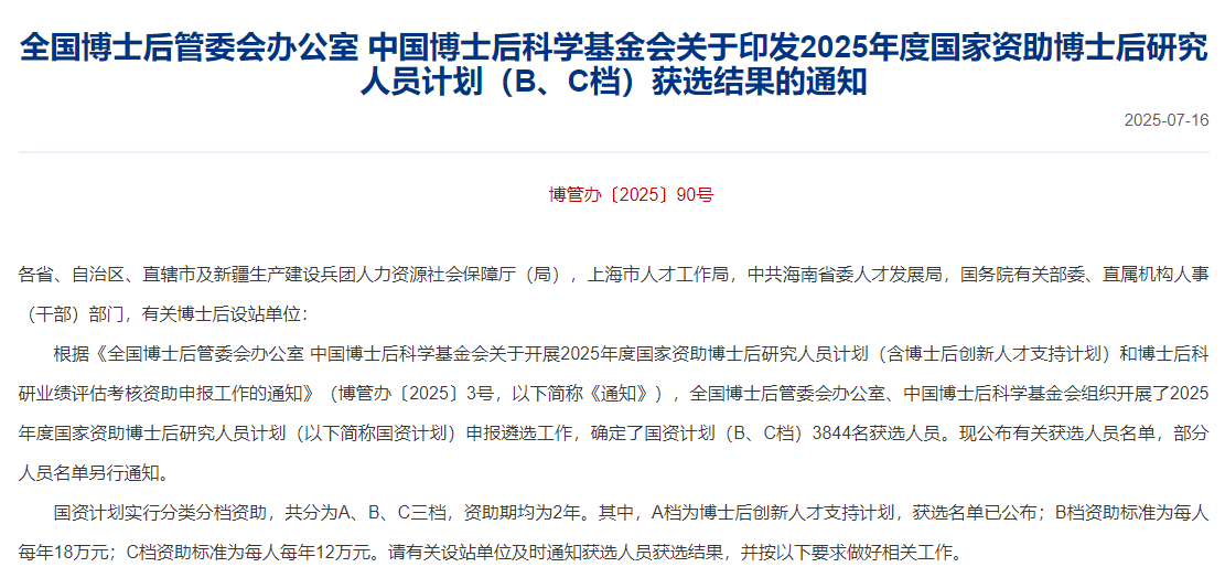 近日发布的《全国博士后管委会办公室 中国博士后科学基金会关于印发2025年度国家资助博士后研究人员计划(B、C档)获选结果的通知》,实验室博士后孙冬磊入选本次国家资助博士后研究人员计划C档。全国共3844人获得国资计划(B、C档),水产一级学科获选13人(B档3人、C档10人)。