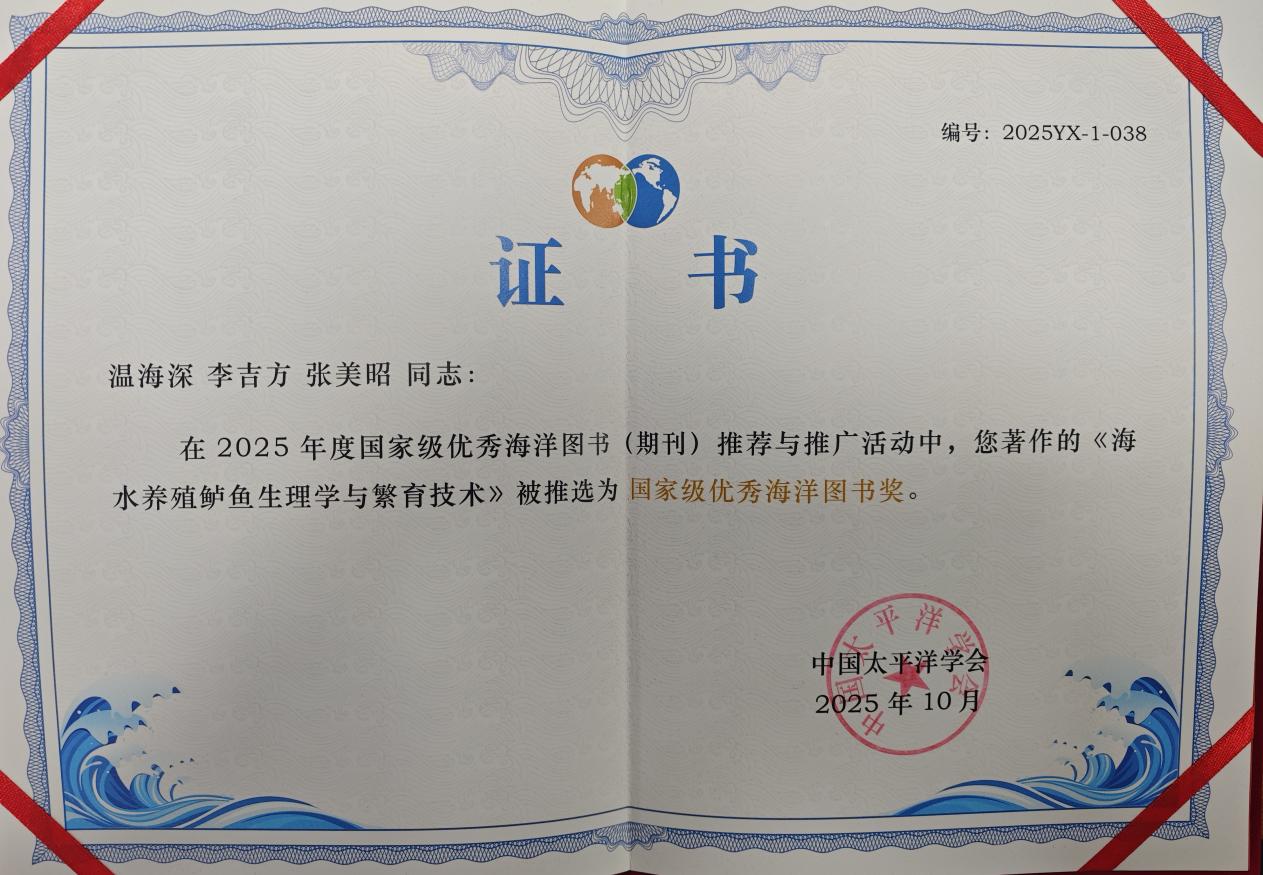 202510月,在中国太平洋学会开展的2025年度国家级优秀海洋图书(期刊)推荐与推广活动中,实验室教师温海深、李吉方、张美昭主编的《海水养殖鲈鱼生理学与繁育技术》荣获国家级优秀海洋图书奖。