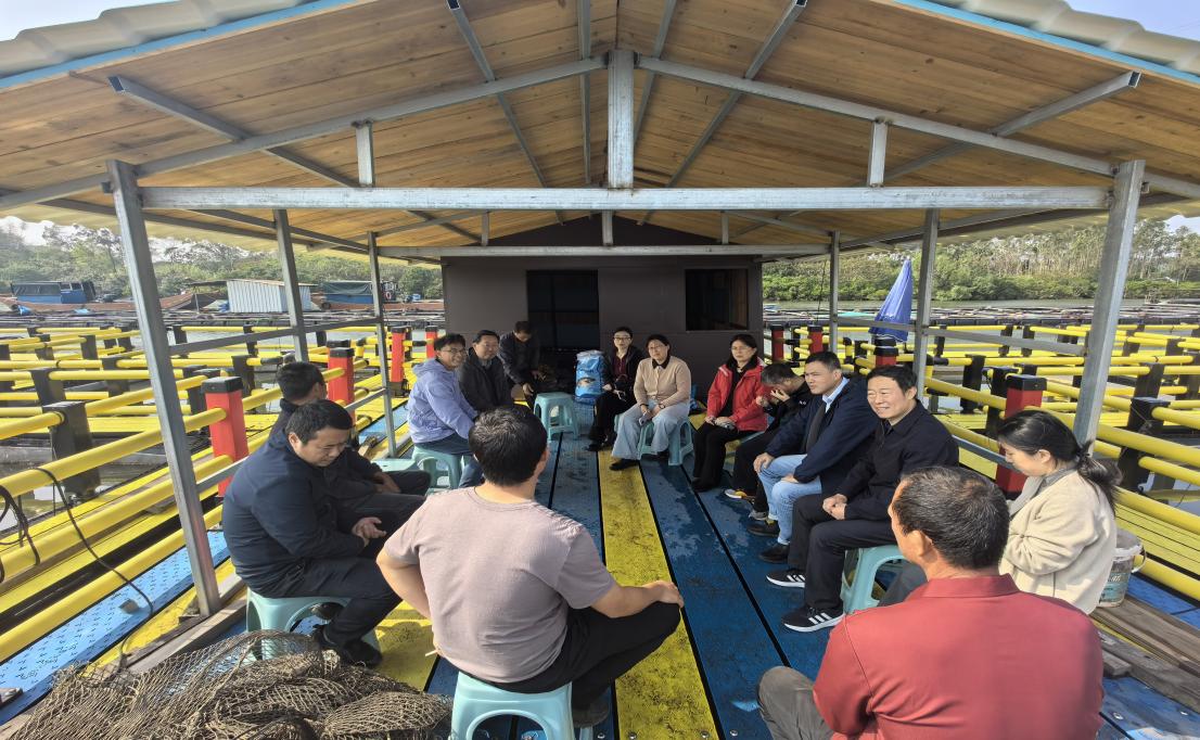 座谈会现场 12月6日上午,调查团队前往防城港市茅岭镇美丽村花鲈养殖企业调研。美丽村村集体合作社运营该公司的花鲈养殖产业链,公司利用茅岭江入海口的地理优势,利用网箱养殖的模式开展花鲈养殖。在网箱鱼排上,调研组专家同美丽村党支部书记、驻村第一书记、花鲈一线养殖工人进行了座谈。