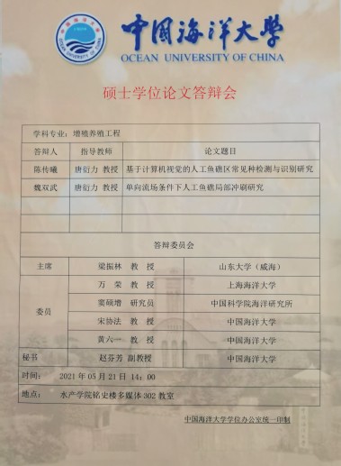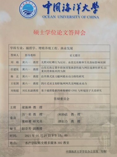 2021年5月21日下午,海洋渔业技术实验室在档案馆多媒体教室举行了2021届研究生毕业论文答辩。答辩委员会由山东大学威海分校海洋学院常务副院长梁振林教授、上海海洋大学校长万荣教授、中国科学研究院海洋研究所窦硕增研究员、中国海洋大学水产学院副院长宋协法教授、中国海洋大学水产学院唐衍力教授、中国海洋大学水产学院渔业系主任黄六一教授组成,其中,梁振林教授担任答辩委员会主席。赵芬芳副教授担任答辩委员会秘书。