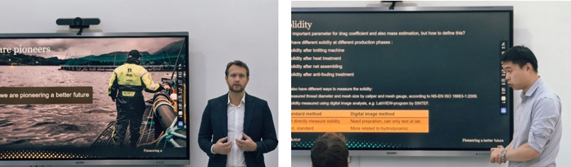 10月27日,Hosaas总监到访中国海洋大学水产学院海洋渔业技术实验室,参加国际合作导师的受聘会议。会议伊始,黄六一教授致欢迎词,通过宣传片全面展示了学院的发展历程和海洋渔业技术实验室的科研成果。在随后举行的合作导师聘任仪式上,正式聘请Arnstein Hosaas总监为中国海洋大学水产学院合作导师。学术交流与讨论环节,Hosaas总监首先向与会人员分享了挪威AKVA集团的发展历程、市场经营及其在海洋养殖装备与系统研发领域内的前沿技术与创新实践。另外,程晖博士围绕养殖网箱水动力研究的相关内容进行专题报告。最后,黄六一教授则就研究室近年来在海洋牧场、海水养殖装备等相关领域内的研究进展做了介绍。双方就共同关注的深远海养殖网箱装备研发技术难题进行了热烈讨论。