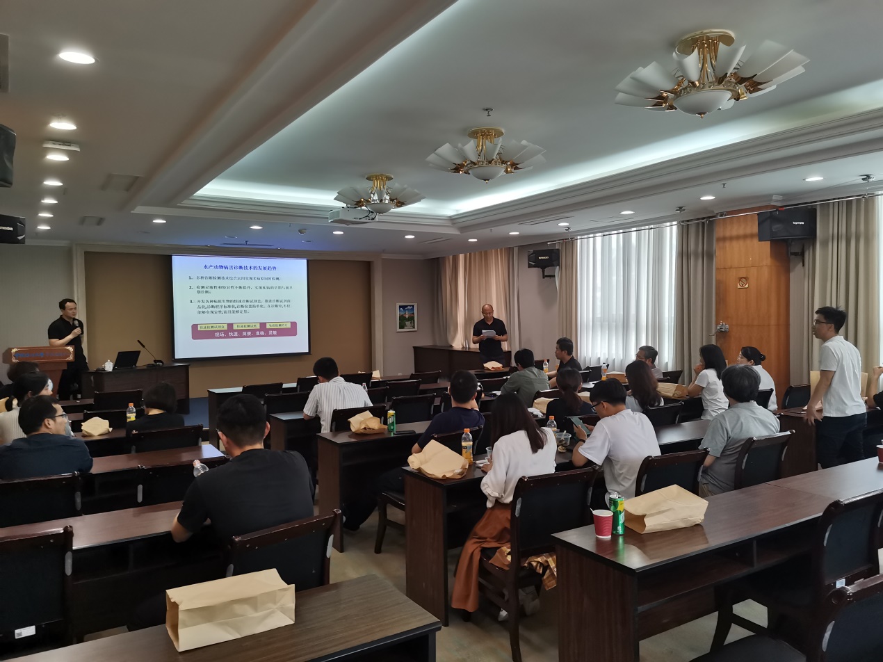 唐小千教授以“水产动物疾病快速检测诊断技术”为题,结合水产病害研究团队多年来在该领域取得的科研成果,系统介绍了水产动物疾病快速检测技术的主要类型、技术原理、应用场景及其发展趋势,全面阐述了该技术在科学指导水产病害防控及保障水产养殖业绿色高质量发展中的价值与意义。与会老师纷纷结合自身在实际科研工作中遇到的相关问题,积极参与交流与讨论。