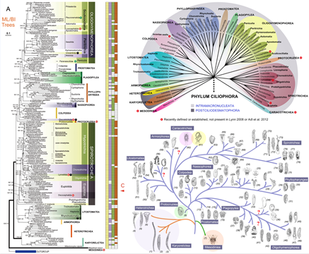 纤毛虫的分子系统学 主要涉及利用标记性基因测序、二级结构分析、系统树构建、基因组系统学分析等手段,对各类纤毛虫原生动物的系统发生与演化、阶元间的关系以及在系统发育树中的地位探讨。此外,该方向的工作还包括对海洋类群的DNA种库的完善构建。本领域的研究将为纤毛虫系统发育、进化以及基因组学等学科研究提供基础信息。