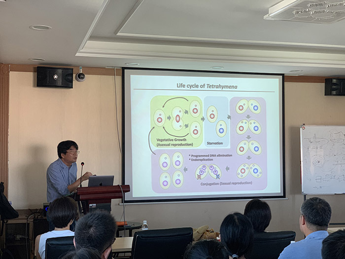 2019年8月29日上午,受原生动物学研究室的邀请,法国人类遗传学研究所(Institute of Human Genetics)的Kazufumi Mochizuki教授及Tomoko Noto博士到访,并分别为师生做了题为Small RNA-directed programmed DNA elimination in Tetrahymena和The Piwi protein Tiwi11p is involved in small RNA-mediated DNA elimination in Tetrahymena 的主题学术报告。