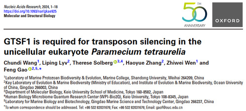 近日,中国海洋大学海洋生物多样性与进化研究所原生动物学团队的高凤课题组在Nucleic Acids Research 杂志发表了题为“GTSF1 is required for transposon silencing in the unicellular eukaryote Paramecium tetraurelia”的研究论文。该研究首次对原生动物中的GTSF1进行了报道,发现其作为PIWI蛋白辅因子的作用是保守的,并揭示了其在纤毛虫转座子删除中的功能与作用机制,为深入了解真核生物转座子抑制机制和演化过程提供了重要资讯。