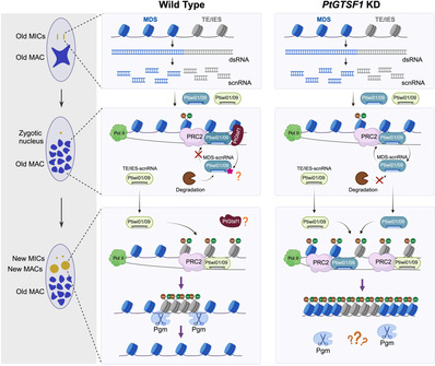 本研究鉴定到了与piRNA命运决定相关的GTSF1。GTSF1与PIWI和PRC2相互作用,并与非转座子piRNA-PIWI复合体上标记的添加相关。缺失GTSF1时,非转座子piRNA与母代体细胞核基因组比对后无法被标记,亦不能被降解,导致由piRNA指导的PRC2复合体以及组蛋白甲基化(H3K9me3与H3K27me3)定位均发生改变,H3K9me3与H3K27me3在转座子上的特异性富集分布消失,并进一步导致转座子删除进程变慢。该工作为进一步探究piRNA的选择与标记提供了重要数据,也为解析纤毛虫中piRNA介导的转座子删除机制提提供了新资讯。