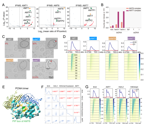 图1.两种不同的6mA甲基化酶复合体(AMT6复合体和AMT7复合体)。(A)6mA甲基化酶复合体组分蛋白AMT1、AMT6及AMT7的IP-MS结果。(B)两种复合体的酶活检测。(C)AMT1和AMT7敲除后表现出伸缩泡异常增大。(D)AMT1、AMT6、AMT7敲除后的6mA水平及基因组分布情况。(E)AF3预测显示PCNA与AMT6在PIP box处相互作用。(F)6mA、AMT7、H2A.Z、H3K4me3及转录的相关性分析。(G)6mA、AMT7、H2A.Z及H3K4me3在基因区的分布。