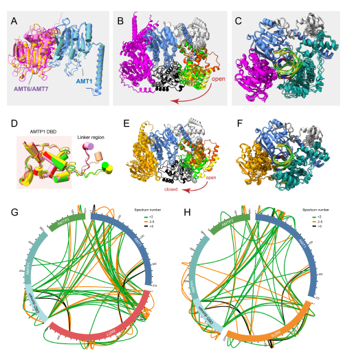 图2.两种6mA甲基化酶复合体的AF3(AlphaFold3)结构预测。(A)AMT6和AMT7复合体的AF3预测模型。(B)AMT7复合体从开放到关闭的动态转换。(C)AMT7复合体与DNA结合后的稳定状态。(D)AMTP1的DNA结合结构域(DBD)是稳定的,而接头区域表现出高度的灵活性。(E)AMT6复合体的从开放到关闭的动态转换。(F)AMT6复合体与DNA结合后的稳定状态。(G)AMT7复合体的蛋白交联结果。(H)AMT6复合体的蛋白交联结果。