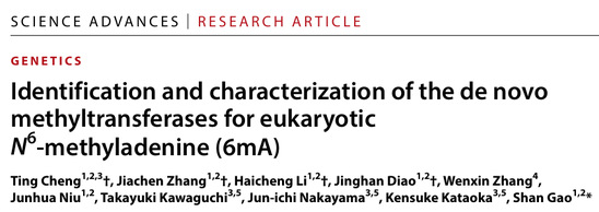 16. Wang, Y., Sheng, Y., Liu, Y., Zhang, W., Cheng, T., Duan, L., Pan, B., Qiao, Y., Liu, Y., and Gao, S., A distinct class of eukaryotic MT-A70 methyltransferases maintain symmetric DNA N6-adenine methylation at the ApT dinucleotides as an epigenetic mark associated with transcription. Nucleic Acids Research, 2019. 47(22): 11771-11789.