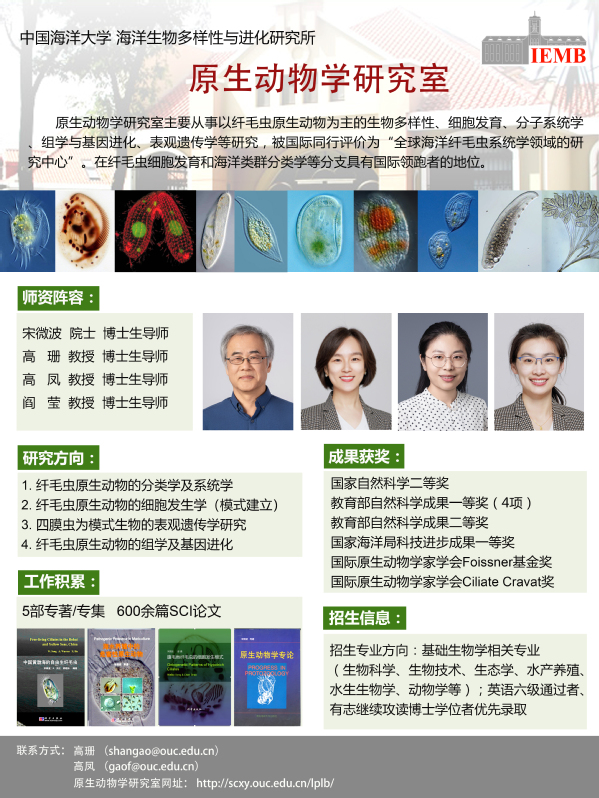 原生动物学研究团队(导师:宋微波院士、高珊教授、高凤教授、阎莹教授)2026年度计划在下列方向招收硕士研究生:报考海洋生命学院全部专业的考生、报考水产学院动物学、水生生物学、水产养殖专业的考生。
