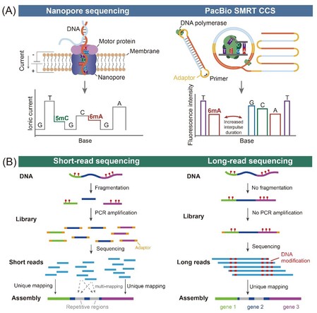 随着6mA研究热度的持续攀升,更高精度、更具扩展性的6mA检测技术应运而生。基于6mA抗体的6mA免疫沉淀测序技术(6mA-IP)往往受限于抗体的亲和力和特异性,而基于化学或酶学脱氨转化的方法虽可达到单碱基分辨率,但其转化效率仍有待提升。近年来,以Pacific Biosciences和Oxford Nanopore Technologies为代表的第三代测序技术,分别通过监测DNA聚合酶动力学扰动和离子电流变化,实现了对DNA甲基化修饰的单碱基分辨率直接检测(图1A)。相比二代测序,三代测序无需PCR扩增和DNA片段化处理,可直接检测表观遗传标记并真实地反应单分子异质性,同时克服了二代测序在序列高度重复区域和结构复杂区域的多重比对问题(图1B)。将三代测序技术和外源6mA标记技术相结合,为解析染色质环境、检测蛋白质—DNA互作位点及利用6mA进行表观遗传编辑研究提供了全新视角。