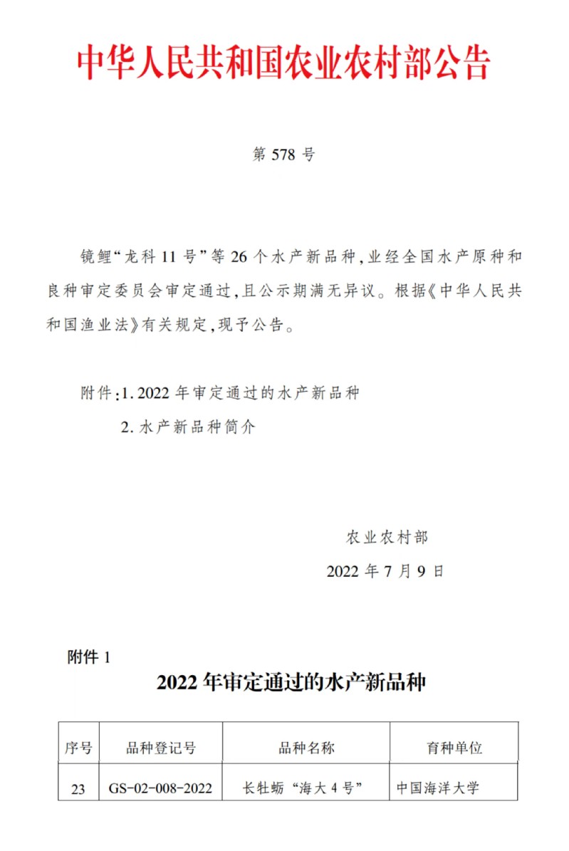 近日,农业农村部印发《中华人民共和国农业农村部公告第578号》,公布了26个经全国水产原种和良种审定委员会审定通过的水产新品种,由中国海洋大学李琪教授团队培育的牡蛎新品种长牡蛎“海大4号”(品种登记号:GS-02-008-2022)名列其中。